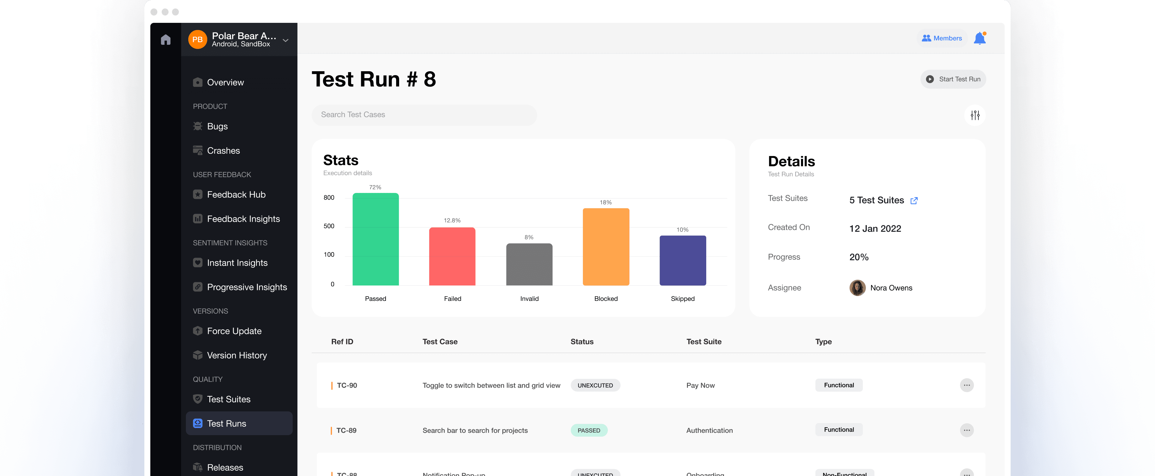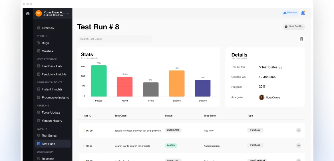 Optimize test suite management for better coordination and coverage. Create and execute detailed test cases for comprehensive quality assurance and accurate app function assessment. The platform improves quality assurance by enabling in-depth analysis through precise test runs and efficiently linking test cases to bug reports using a QR code.